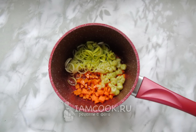 Морковь, сельдерей и лук-порей нарежьте произвольно. Выложите в кастрюлю с толстым дном или антипригарным покрытием. Налейте растительное масло.