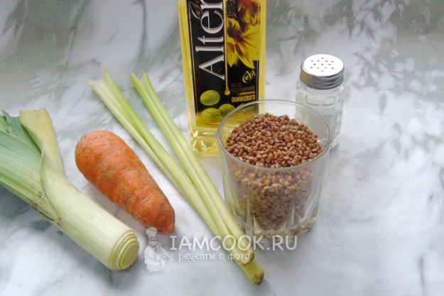 Соберите ингредиенты для приготовления гречки с сельдереем.