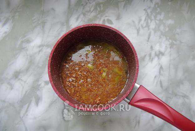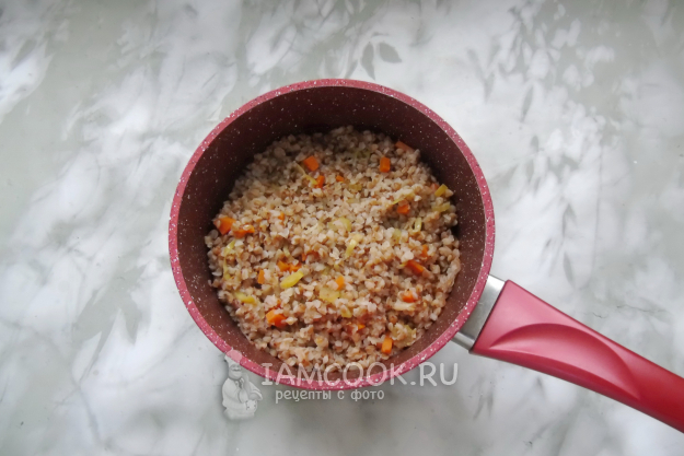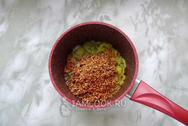 Гречневую крупу переберите, если нужно. Тщательно помойте. Добавьте в кастрюлю с овощами.