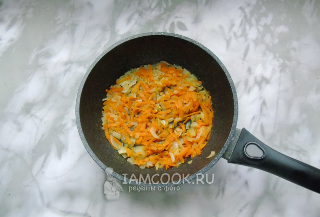 А пока тесто подходит, займитесь начинкой. Морковь натрите на терке, а лук мелко нарежьте. Налейте в сковороду 2-3 столовые ложки растительного масла и пассеруйте овощи до мягкости на небольшом огне.