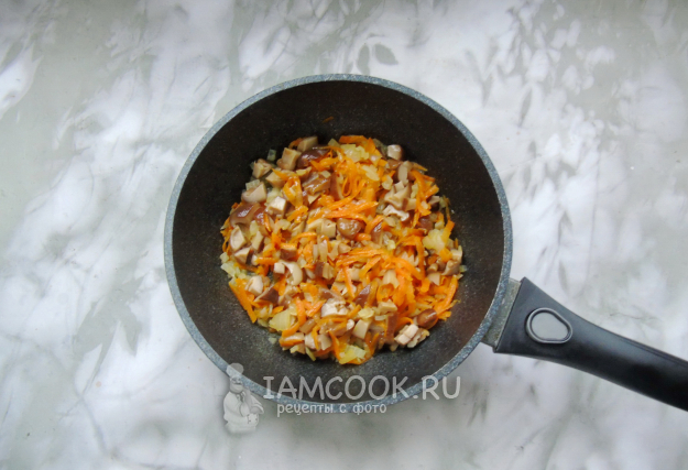 Добавьте к моркови и луку, перемешайте. Начинку можно поперчить, но солить не надо.