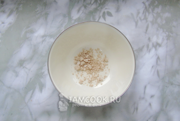 Налейте теплое молоко и насыпьте сахар, перемешайте. Дайте постоять. Через 15 минут дрожжи активируются.