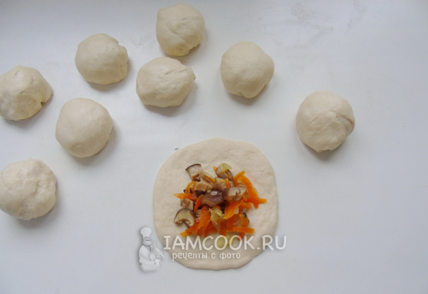 Готовое к работе тесто достаньте из миски и обомните. Разделите на шарики весом приблизительно 50 граммов. Каждый шарик раскатайте в лепешку. На середину лепешки выложите начинку.