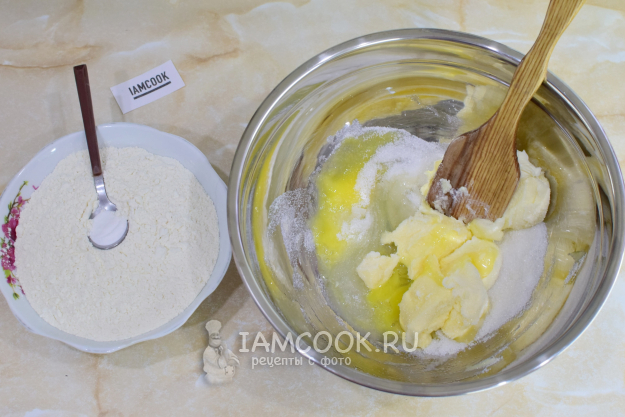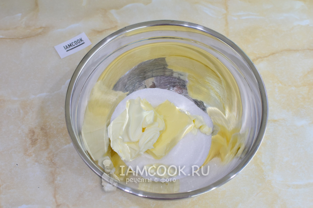 Для приготовления песочного теста соедините мягкое сливочное масло и сахар.