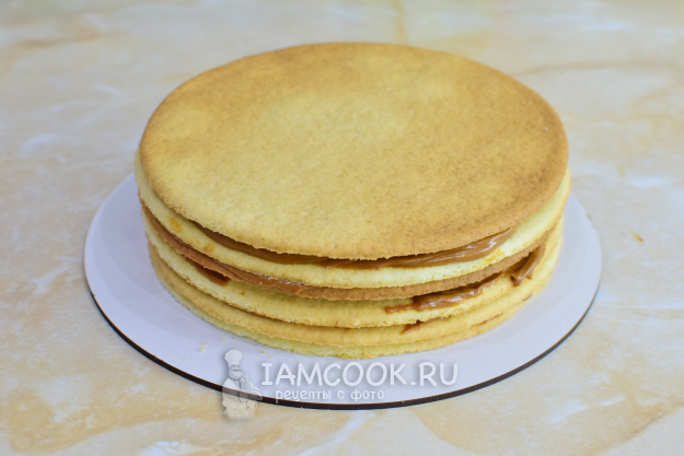 Готовым кремом прослоите все коржи. В каждую прослойку - по 100 граммов крема.