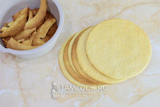 Так испеките все 6 коржей. Обрезки сложите отдельно - они пригодятся для обсыпки торта.