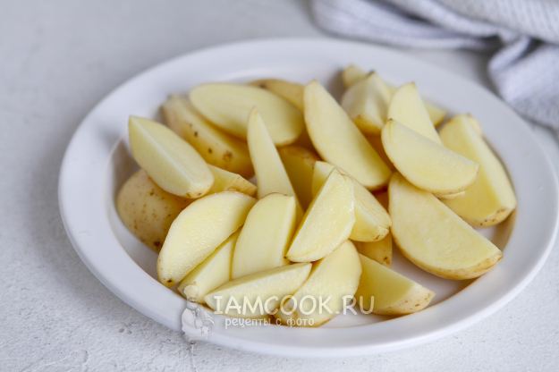 Подготовьте картофель. Если у вас молодой картофель, как в моем случае, то его не обязательно чистить. Промойте, обсушите картофель и нарежьте просто на четвертинки.