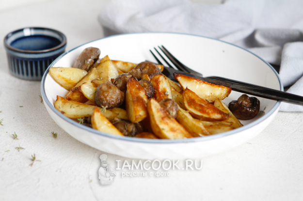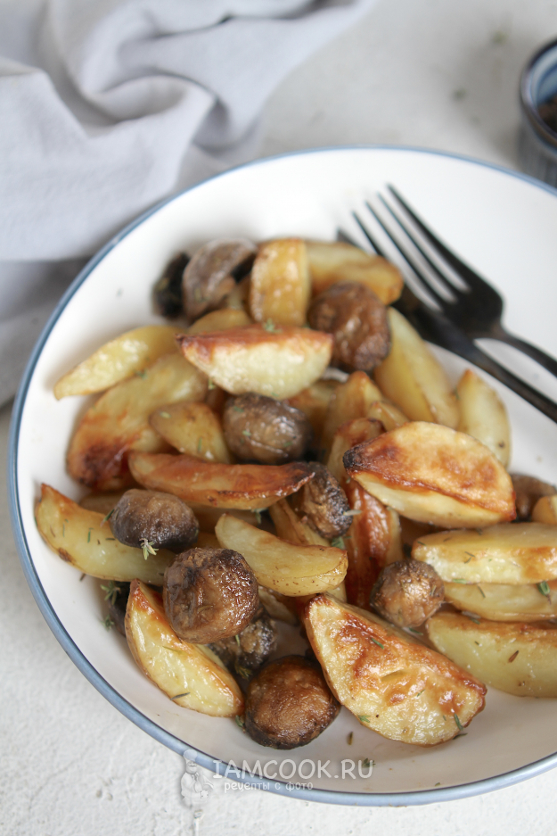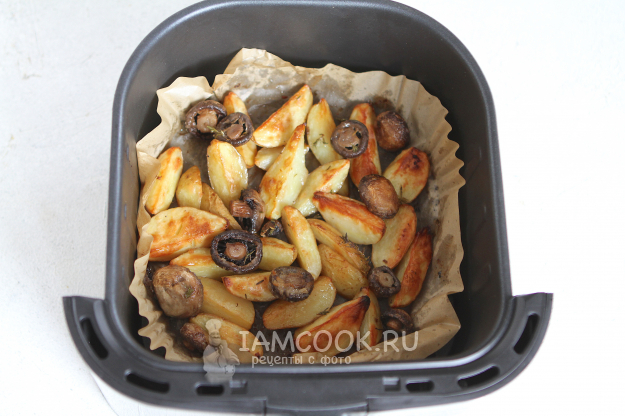 Запекать картофель с грибами в аэрогриле при 185 градусах 20 минут. Минут через 10 аккуратно перемешайте картошку с грибами, она уже станет немного подрумяниваться, и продолжайте запекать. Время приготовления может быть немного увеличено. Зависит это от сорта картофеля и того, насколько крупными у вас будут дольки.