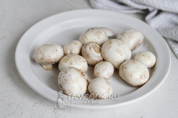 Грибы шампиньоны промыть и обсушить. Если грибы крупные, то разрежьте их пополам. Средние и маленькие грибочки по размеру лучше запекать целиком.
