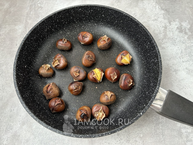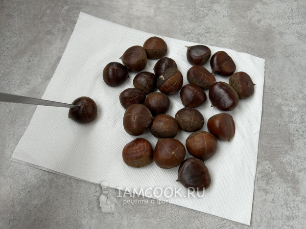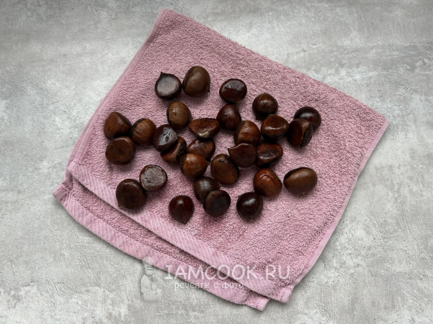 Слейте воду и обсушите каштаны на кухонном полотенце.