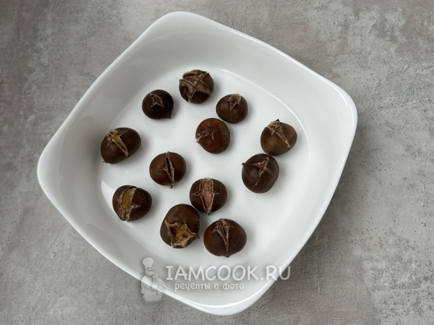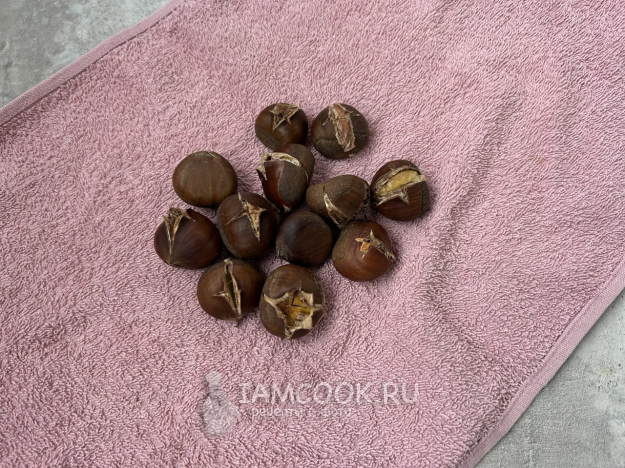 Заверните их в полотенце и крепко сожмите, до появления треска, подержите еще 5 минут. После этого очистите каштаны от кожуры.