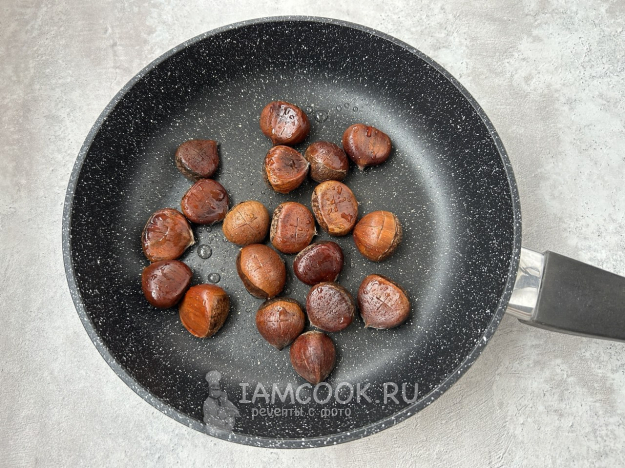 Первый способ: жареные каштаны на сковороде. На разогретую сковороду выложите каштаны. Сбрызните холодной водой и накройте крышкой, обжаривайте на огне чуть выше среднего 20-25 минут. Периодически сбрызгивайте водой и переворачивайте, чтобы каштаны равномерно прожарились.