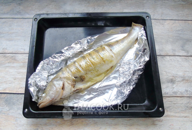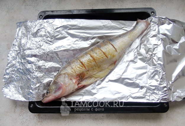 Выложите на противень с фольгой. Заверните в фольгу так, чтобы она не касалась поверхности рыбы. В противном случае в процессе запекания фольга может прилипнуть к шкурке.