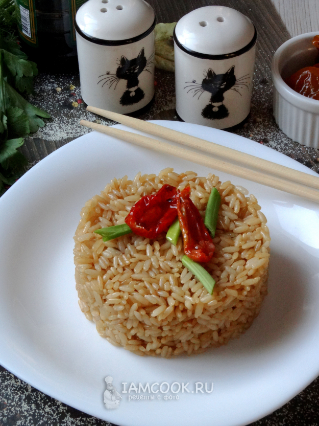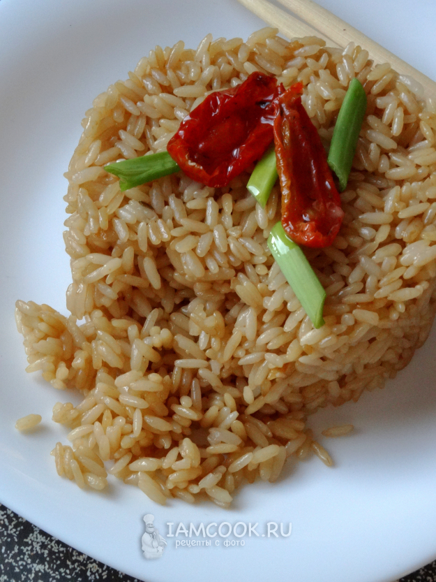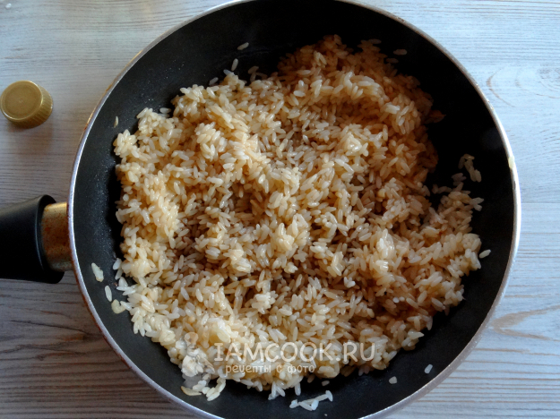 Поставить на средний огонь и готовить рис с соевым соусом на сковороде ещё 5-8 минут, помешивая.