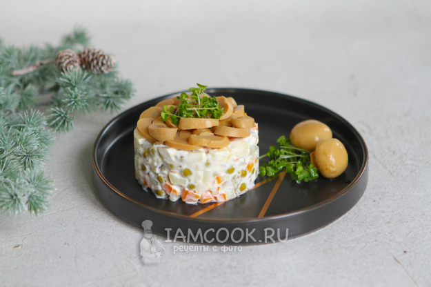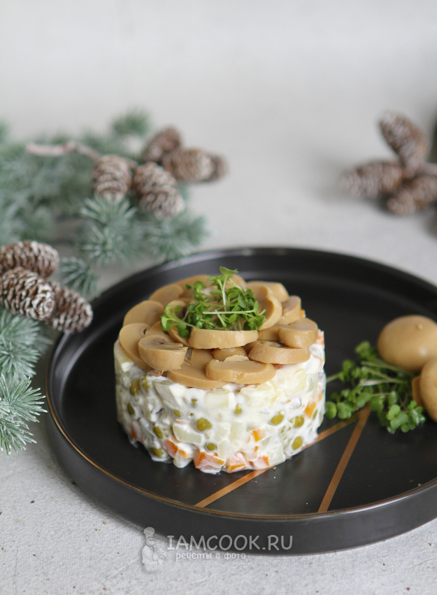 Сверху украсьте салат маринованными шампиньонами. Разрежьте их на дольки и выложите по кругу.