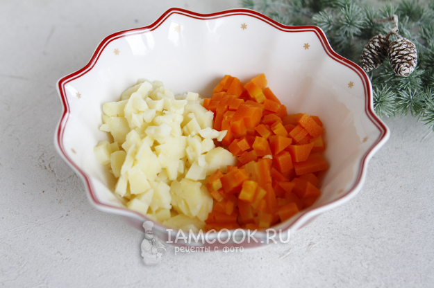 Овощи остудить, почистить и нарезать на мелкие кубики. Переложить овощи в глубокую чашу.