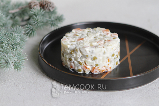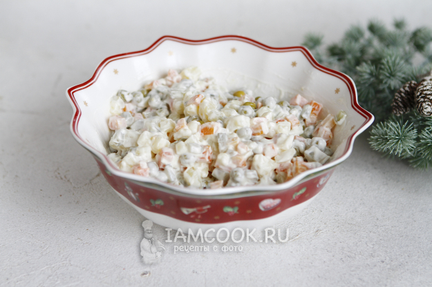 Постный салат Оливье «Ужин ацтека» с грибами готов. Перед подачей его можно немного охладить.