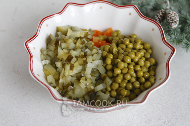 Огурцы соленые также нарезать на мелкие кубики. С горошка слить аквафабу, откинуть на дуршлаг. Аквафабу не рекомендую выливать, из нее можно приготовить постный майонез.