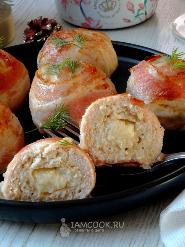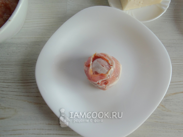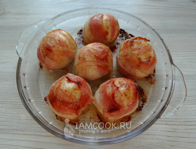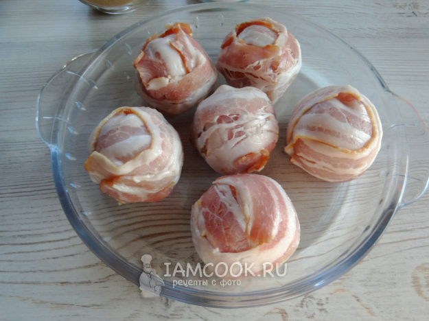 Запекать куриные шарики в беконе при температуре 180 градусов до румяного состояния, у меня ушло 35 минут.