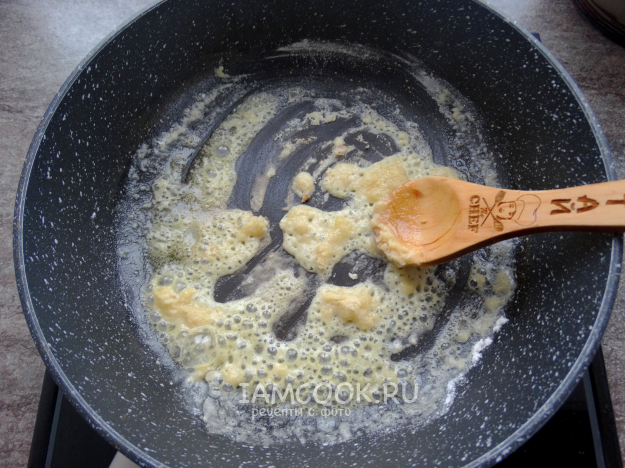 В сковороде или сотейнике растопить масло. Всыпать муку, быстро перемешать.