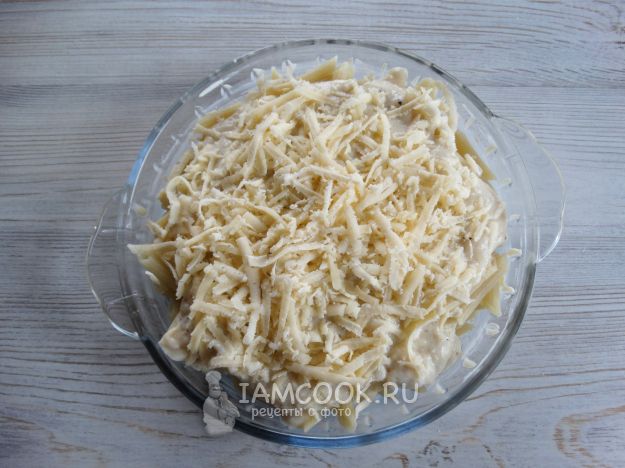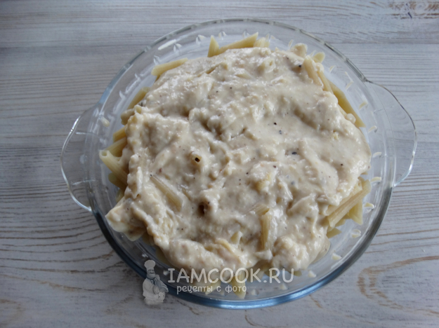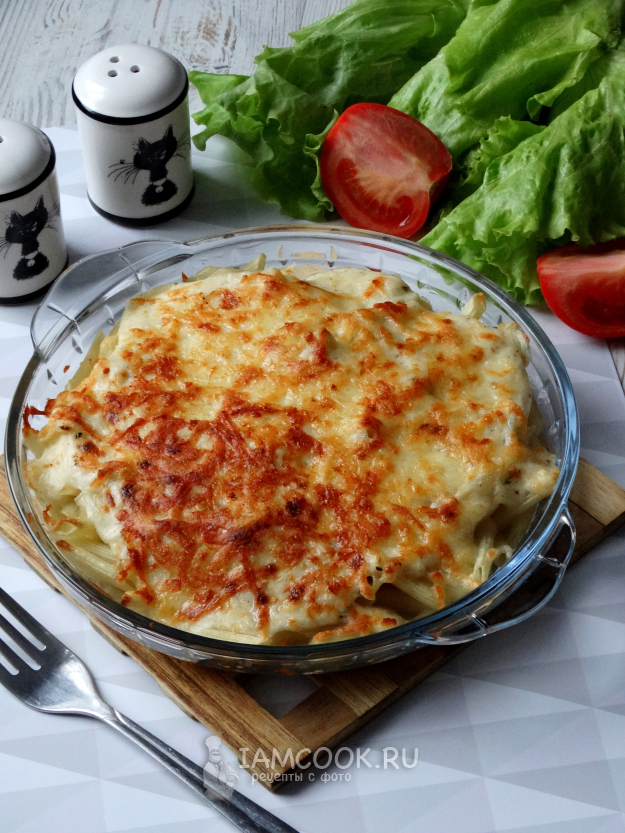 Запекать макароны под соусом бешамель в духовке при температуре 190 градусов до румяной корочки, можно под грилем 5-10 минут.