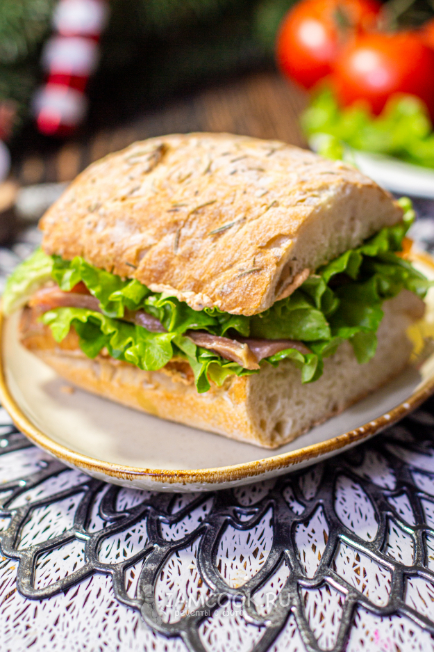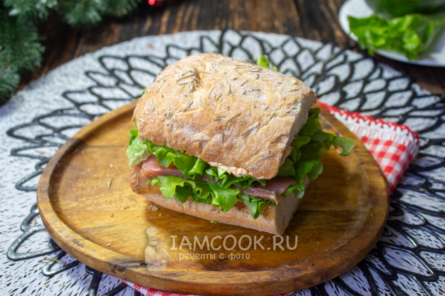 Для одного сэндвича чиабатту разрежьте пополам, а затем половину нарежьте на 2 части.