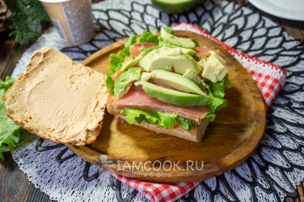 На рыбку положите кусочки авокадо. Вторую, верхнюю часть чиабатты тоже смажьте творожным сыром.