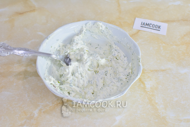 Для начинки смешайте мягкий творожный сыр с измельченной зеленью и чесноком.