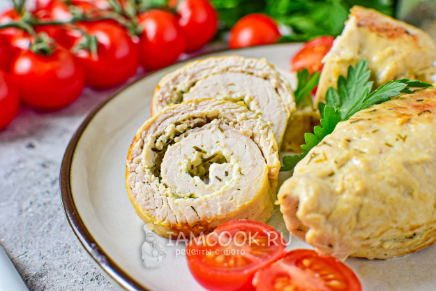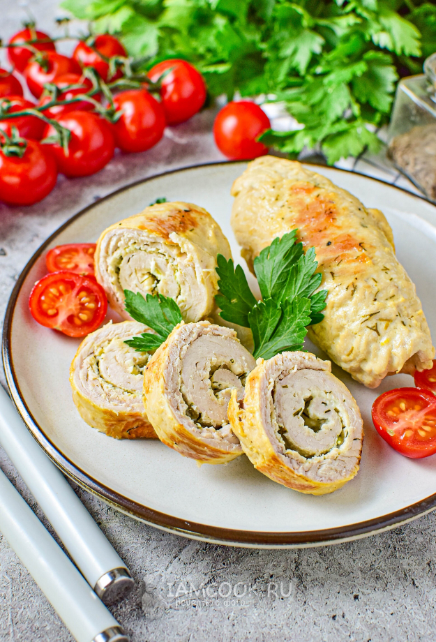 Рулетики из индейки с творожным сыром готовы. Выложите их на тарелку и подавайте к столу. Приятного аппетита!