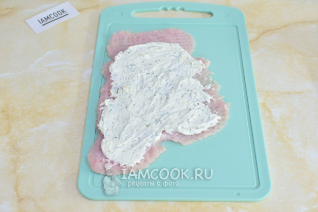 Отбитое мясо посыпьте солью и специями. Затем намажьте готовой начинкой из творожного сыра.