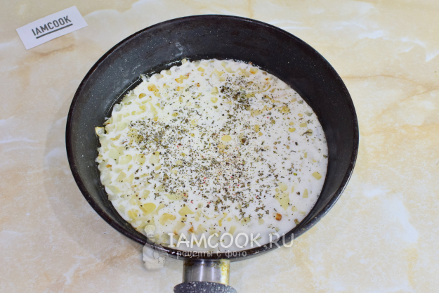 Затем добавьте к нему горячую воду и сливки. По вкусу подсыпьте соль и специи. Потушите 4-5 минут на небольшом огне.