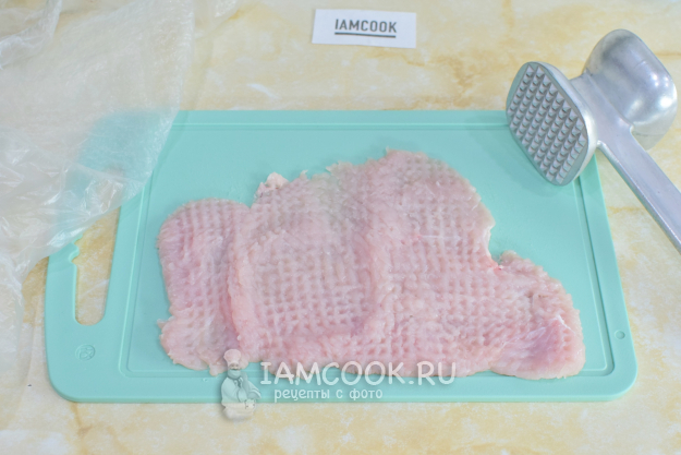 Мясо индейки нарежьте на порционные кусочки и каждый отбейте. Для отбивания накрывайте мясо пленкой, чтобы края кусочка не рвались при отбивании.