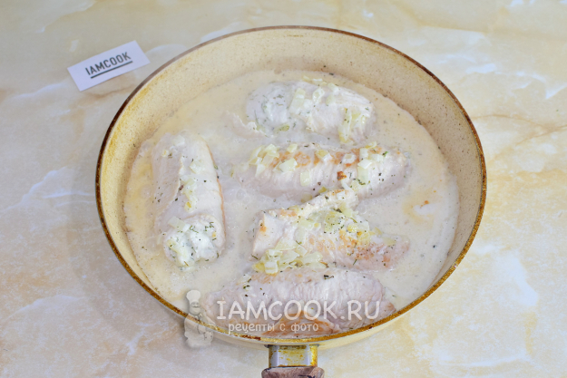 Получившимся сливочным соусом залейте рулетики и потушите их под крышкой 12-15 минут. Периодически рулетики разворачивайте для более равномерного их приготовления.