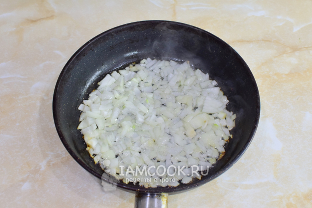 В другой сковороде обжарьте 1-2 минуты нарезанный лук.