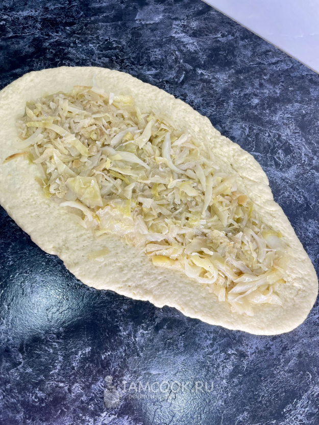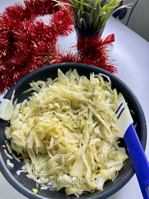 В это время приготовьте начинку. Начинка может быть совершенно любая, на ваш вкус. Тесто универсальное и подойдёт ко всему. Я потушила капусту.