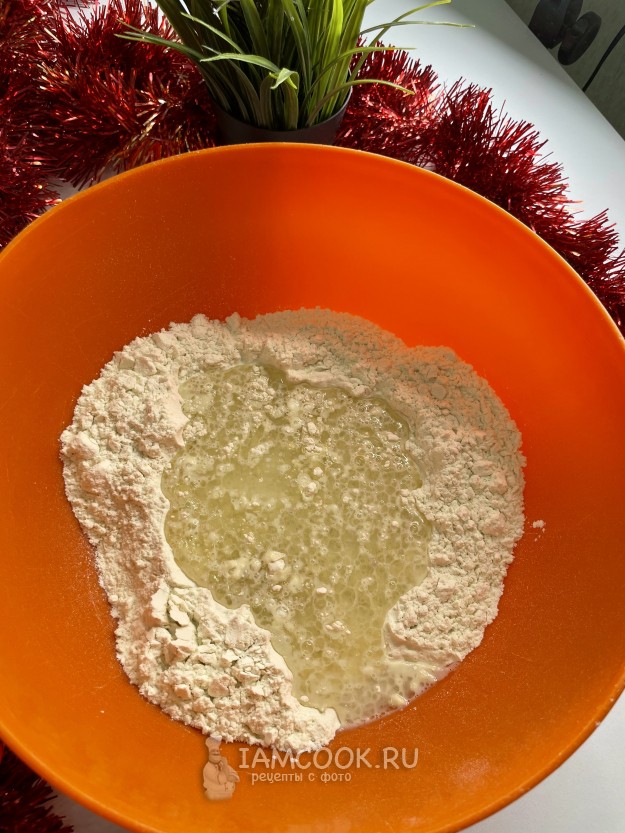 Добавляем растительное масло, перемешиваем и вливаем смесь к муке.