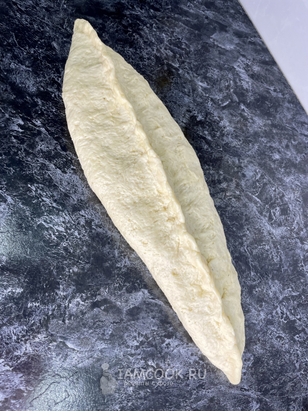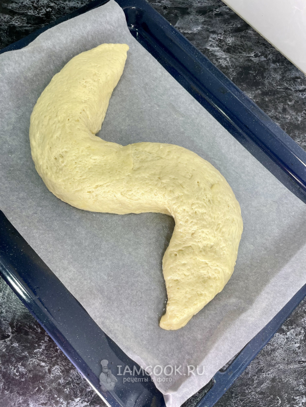 Тесто раскатайте в пласт. Одна сторона должна быть чуть шире, чем другая. Толщина теста будет зависеть от того, насколько пышную вы хотите получить выпечку, а длина раскатки - от того, насколько длинная змейка вам нужна. По центру выложите начинку.