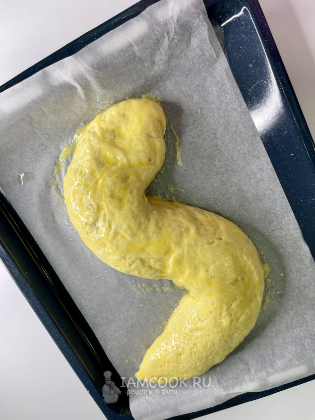 Переверните рулет швом вниз и слегка потяните руками. Выложите на смазанный маслом противень и сформируйте тело и голову. Можно попробовать сделать насечки ножом для имитации кожи. Накройте заготовку полотенцем и дайте полежать 30 минут.