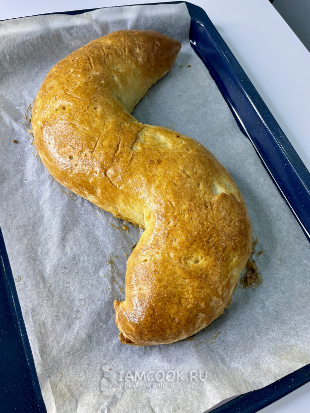 Затем смажьте желтком и выпекайте в духовке при температуре 180 градусов около 30 минут.