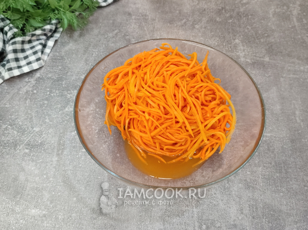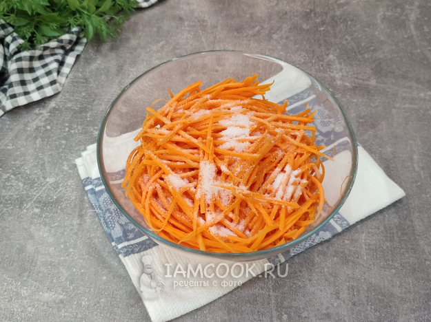 Морковь натрите на специальной терке или нарежьте ножом соломкой. Добавьте к моркови соль и сахар, перемешайте. Оставьте минут на 15-20.