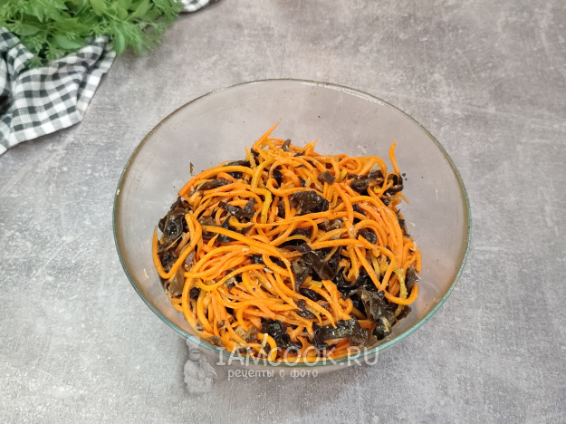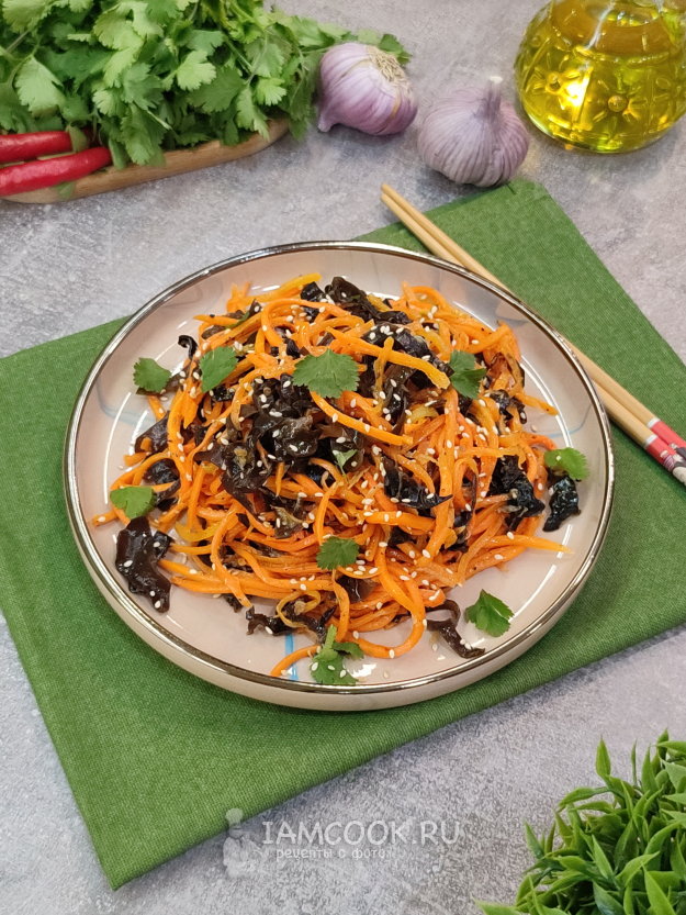 Наш постный вкуснейший салат готов! Подавайте морковь по-корейски с древесными грибами, украсив зеленью, кунжутом по желанию). Можно также подать рис, сдобрив его соевым соусом, и получится вкусный и питательный обед!