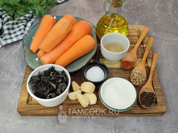 Соберите ингредиенты для приготовления моркови по-корейски с древесными грибами.
