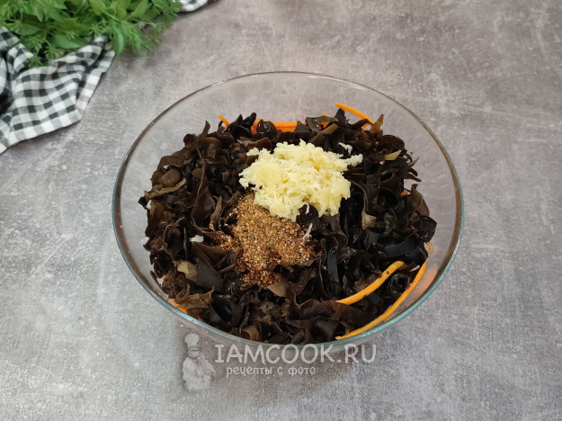 В миску к моркови выкладываем грибы. Наверх насыпаем измельченные специи и чеснок, оставляем горкой наверху, не перемешиваем.