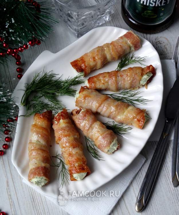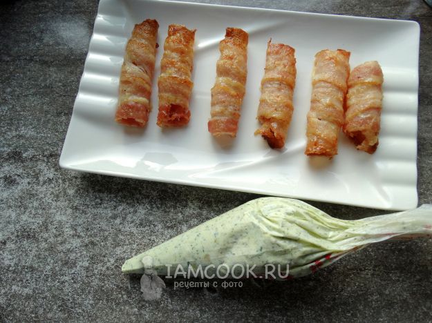 Наполнить беконовые трубочки начинкой, удобнее это делать с обеих сторон.