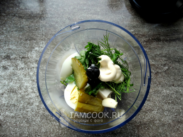 В чашу блендера сложить сыр, очищенное яйцо, огурец, зелень, чеснок и майонез.