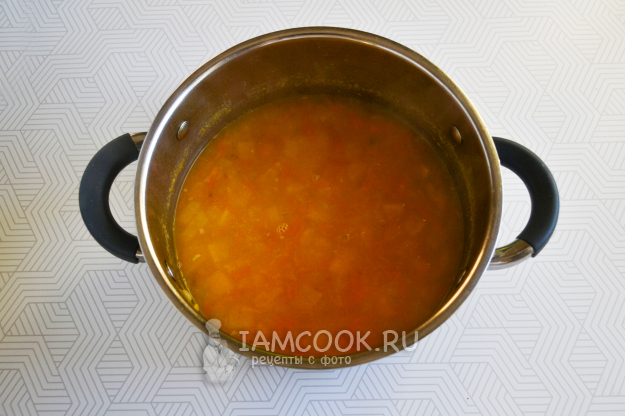 Влейте горячую воду, доведите суп до кипения и варите до полной готовности картошки и чечевицы. На приготовление понадобится примерно 25-30 минут. Во время варки посолите суп.