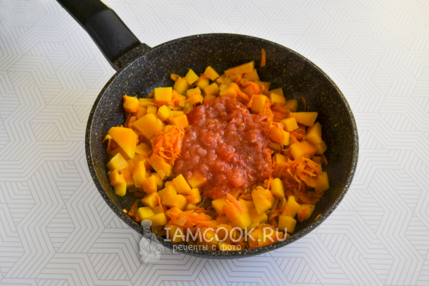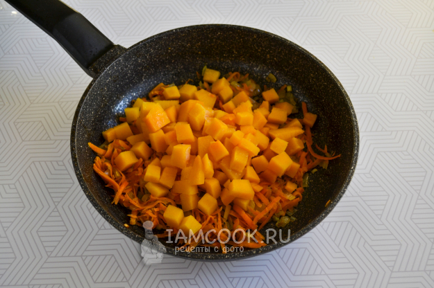 Положите в сковороду нарезанную на мелкие кубики тыкву. Перемешайте, тушите 7-8 минут. Если необходимо, то добавьте немного растительного масла.