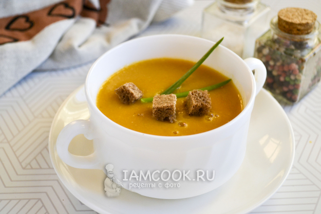 Подавайте тыквенный суп-пюре горячим, добавив в тарелку сухарики.