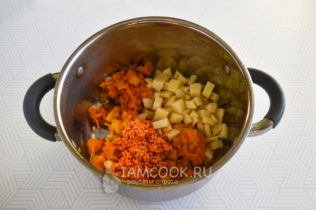Переложите овощи со сковороды в кастрюлю, добавьте нарезанный на кубики картофель и промытую чечевицу.