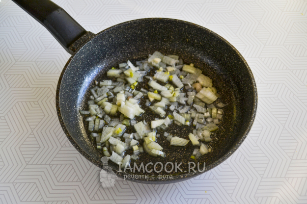 Разогрейте сковороду с растительным маслом и положите мелко нарезанный репчатый лук.